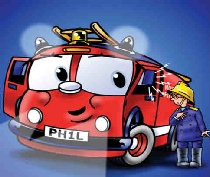 Phil is the fire engine at Valley End Fire Station. Valley End is in Mossy Moor. Phil likes to go to Mossy Moor school where he and the Fire Fighters tell the children not to play with matches, not to make false alarm calls to the Fire Brigade and to be careful in the kitchen near hot pans.